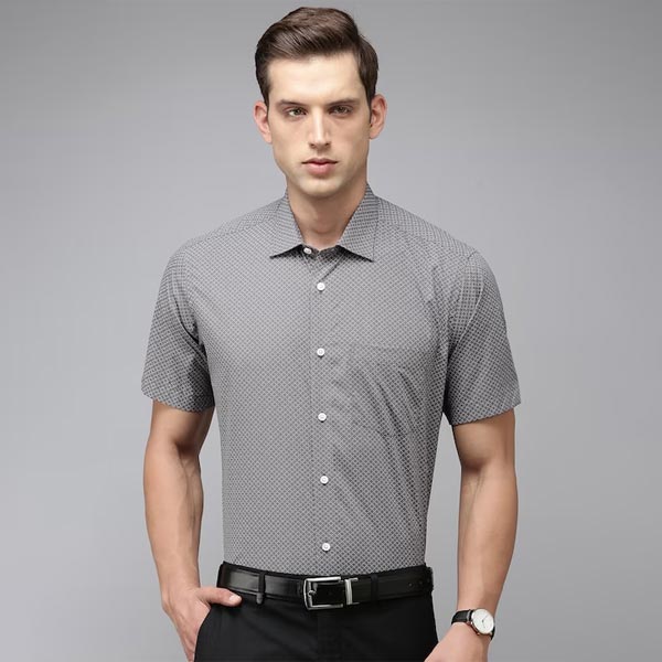 Grey geometric printed opaque Formal shirt, has a spread collar, button placket, 1 patch pocket, short regular sleeves, straight hem